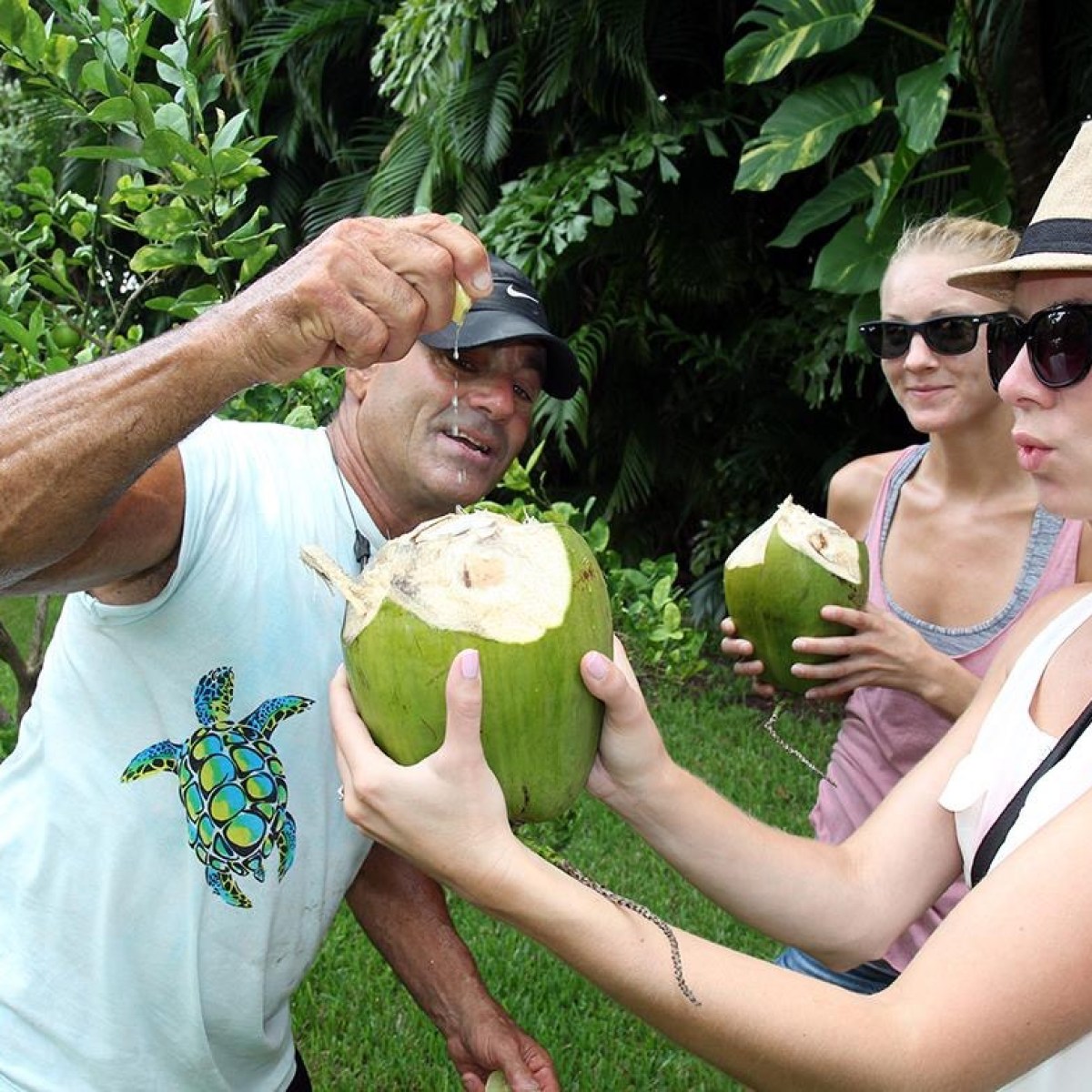 I never go anywhere without my trusty machete. One of the signature plants of the tropics is the coconut palm and I surely stop to cut open a good sampling of this magical tree’s fruit on my tour. You get to taste its sweet water and delectable meat fresh from the source. When key limes are in season, we will gather a few and “put de’ lime in de’ coconut,” just as the song suggests. Could life be any better than that?